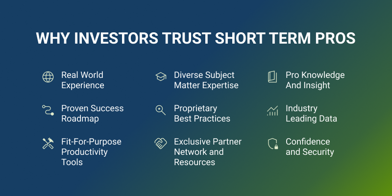 Short Term Pros has pioneered a revolutionary new approach which champions the individual investor and simplifies the path to short term success. We provide everything you need to build, grow and scale your business, in one place.